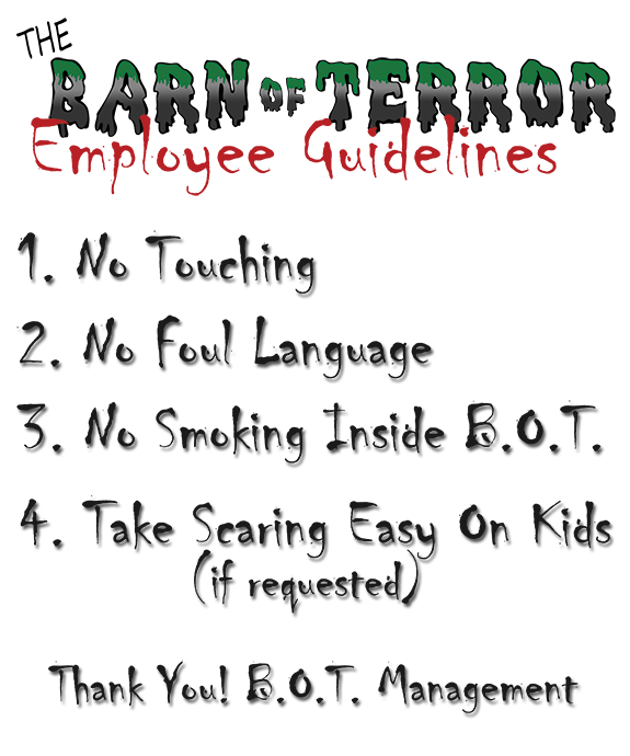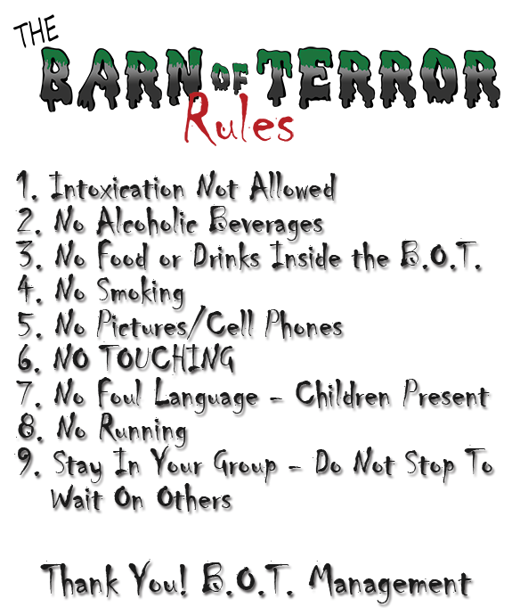 The B.O.T. will be implementing a COVID-19 plan of action. The B.O.T. has long prohibited facial coverings and masks at our venue to ensure the safety and security of our customer family and staff. With the current pandemic situation, we are temporarily suspending this rule to allow facial coverings of the nose and mouth. We strongly encourage the use of such coverings to prevent the spread of COVID-19. Please note that it is the patrons responsibility to follow all State and County orders regarding facial covering use and social distancing. The B.O.T. does not act as an enforcement agency of those public agencies or orders. All B.O.T. staff will be wearing mask when a safe 6ft distance can not be met. All items often touched by patrons will be wiped down often to help limit exposure. We will also be practicing social distancing while waiting to go into the haunt, we will have a number call out system so that patrons will not have to wait in line (similar to how restaurants do it). B.O.T. staff will have there temperatures taken prior to working and asked to leave or not show up for work if they are feeling ill. We will do our part the best we can and want to thank you all in advance for your patronage, cooperation and mutual respect to one another as we enjoy another great season at the B.O.T., Let’s make this 2020 B.O.T. season the best there’s ever been.